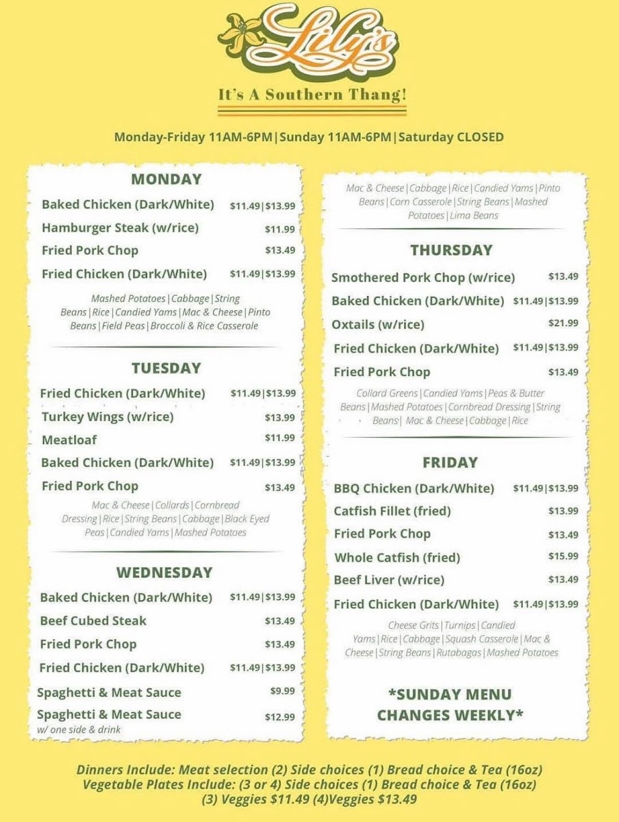Welcome to Lily's, a hidden gem for southern comfort food located at 6597 Whittlesey Blvd, Columbus, GA. This cozy eatery boasts an inviting atmosphere, enhanced by gospel music that complements the delicious dishes they serve. The menu is a feast for the senses, featuring mouthwatering options like baked chicken, fried pork chops, and turkey wings. Each dish is prepared with care, ensuring authentic southern flavors shine through.